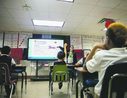 Jessica Lemmer goes over a fraction problem with her third grade math class on Jan. 14, 2018, at Edward Titche Elementary School in the Pleasant Grove area of Dallas. Leslie Boorhem-Stephenson for The Texas Tribune
