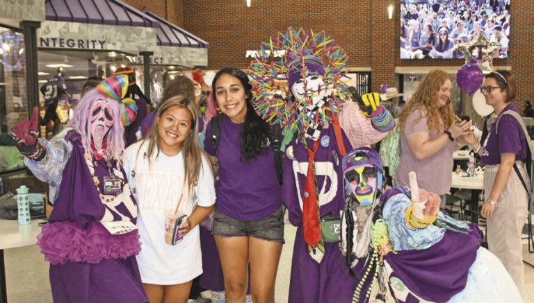 Members of Tarleton’s Purple Poo, the oldest spirit organization in the state of Texas, welcome students to campus during the first day of classes on Aug. 17. The Purple Poo consists of 20 members, 10 guy and 10 girls, with the mission to promote the spirit of Tarleton. Maci Guay/For the Empire-Tribune